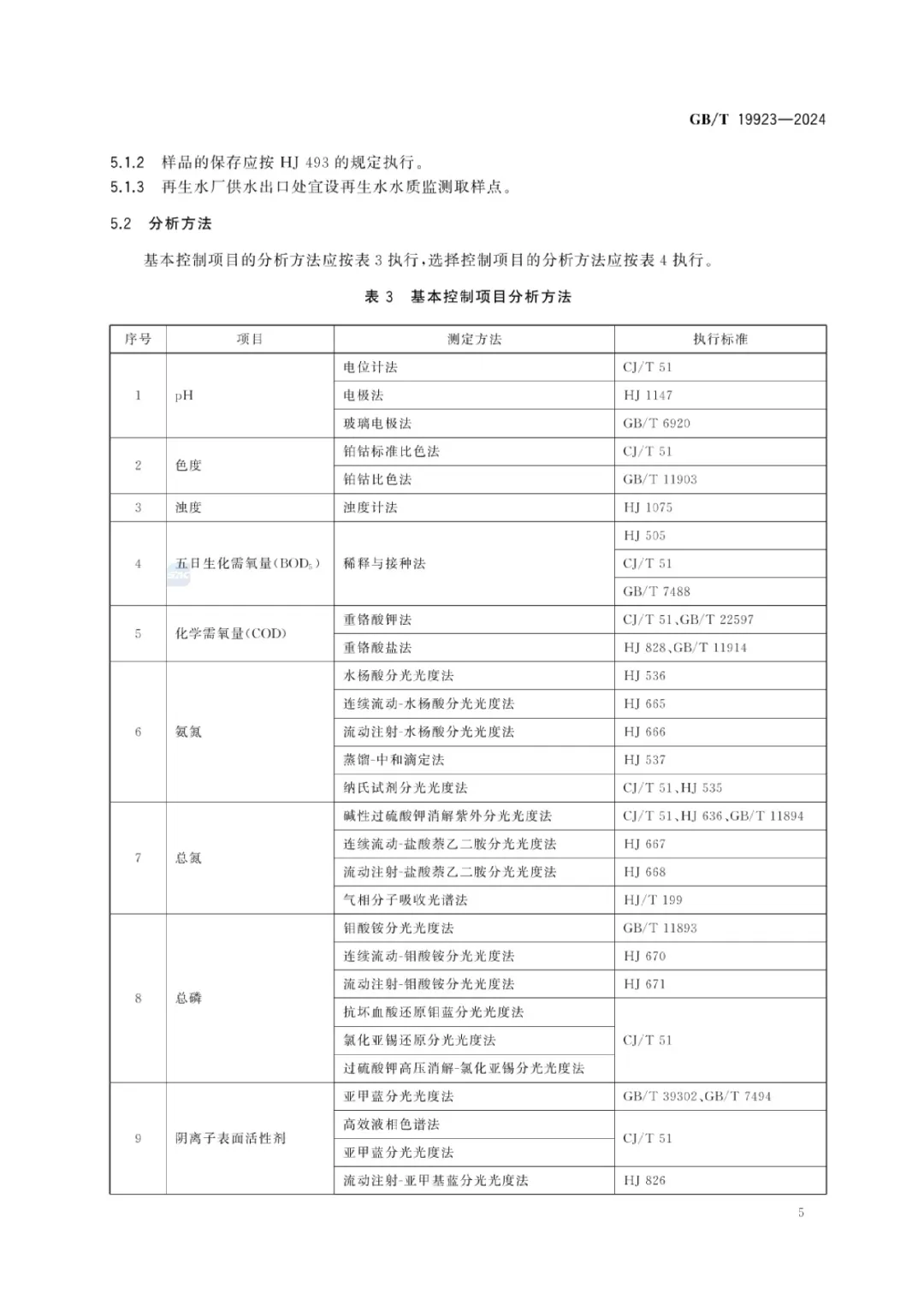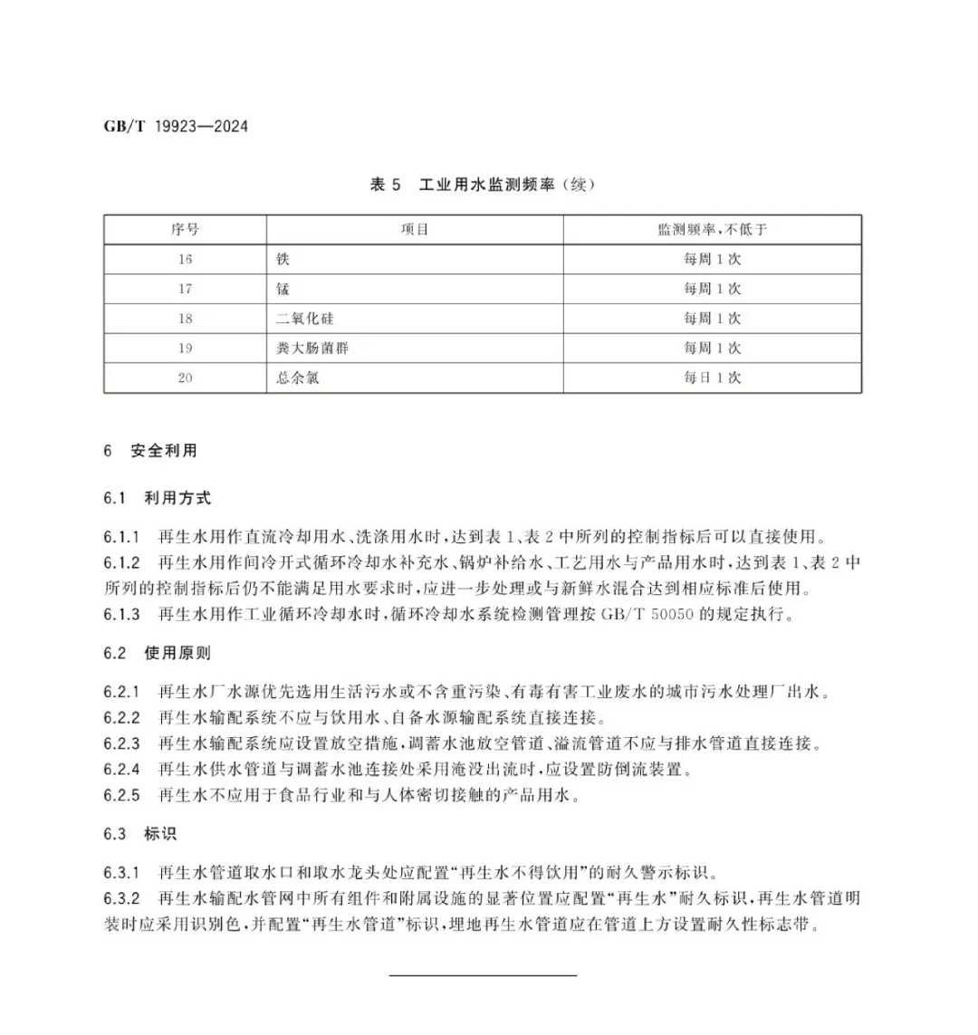 GB/T19923-2024《城市污水再生利用 工業用水水質》具有以下創新點: (1)與新加坡公用事業局制定的《供水應用手冊》和《新加坡中水回用技術指南第一版》、美國環境保護署(EPA)《2012 再生水利用指南》、歐盟水回用法規(Regulation(EU)2020/741);世界衛生組織(WHO)頒布的《廢水、污水和灰水安全使用指南》;ISO《工業冷卻系統中再生水的使用第1 部分:技術準則》和《工業廢水軟化和脫鹽回用指南》。等國家和國際組織的標準進行了對標,通過參考國際標準和先進國家的標準,使修訂后標準的科學性、先進性有較大提高;(2)為進一步擴大再生水工業回用量,推動節水型社會建設,在保障工業用水安全的前提下,簡化了水質分類、將水質指標調整為基本控制項目和選擇性控制項目;取消了1 項指標,增加了 3 項指標,修改了16 項指標限值;(3)針對我國幅員遼闊,各地城市用水水源中離子性指標差別較大,導致城市污水中硬度、氯離子和硫酸根離子可能有幾倍到幾十倍的差別;不同的回用途徑對上述離子濃度的要求也有很大差別。為提高標準的適用性和覆蓋性,將工業用水水質指標調整為一般性控制指標和選擇性控制指標,供需雙方可根據當地的實際情況選擇控制;(4)《城市污水再生利用工業用水水質》控制項目22個,在同系列標準中控制項目最多。目前,我國的水質檢測有國標GB標準、生態環境部的HJ 標準和住房和城鄉建設部的CJ標準。經過梳理,本標準包含的22個控制項目涉及現行國標27部,行標36部,多數控制項目有3種及以上的分析方法,在編制過程中,對以上水質檢測方法進行了全面梳理,從降低水質檢測環境影響和對人體健康風險、不推薦采用禁用物質的檢測方法、降低化驗室管理成本等原則出發推薦了水質檢測方法。